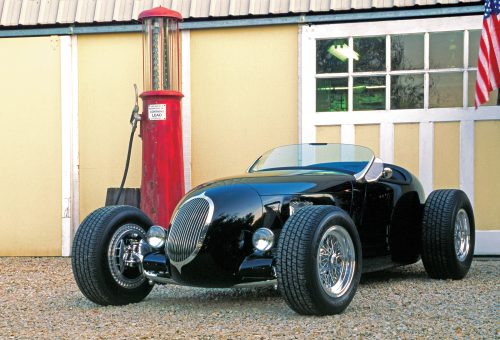 From a distance, this roadster appears to be from another place, far from American shores, as much as from another era. On closer approach, the Borrani wire wheels conjure thoughts of European heritage, although the shape borrows as much from past Indy roadsters and Sprinters as it does from the